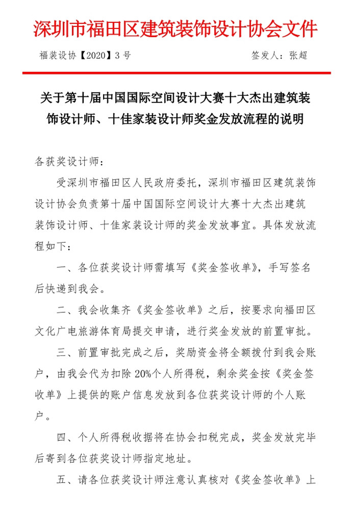 關于第十屆中國國際空間設計大賽十大杰出建筑裝飾設計師、十佳家裝設計師獎金發放流程的說明