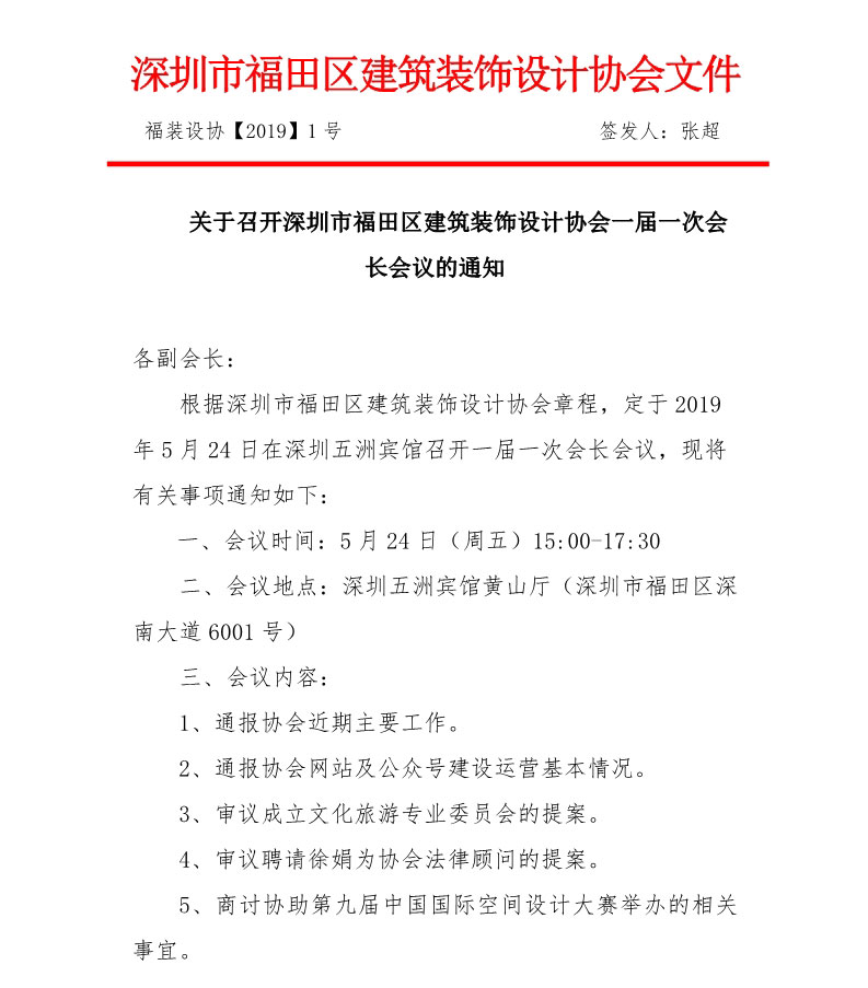 關于召開深圳市福田區建筑裝飾設計協會一屆一次會長會議的通知