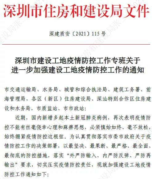 深圳市建設工地疫情防控工作專班發布了關于進一步加強建設工地疫情防控工作的通知。