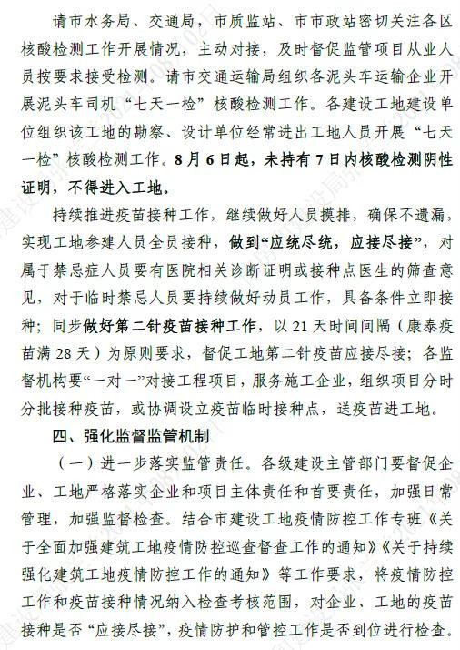 3、各級建設主管部門、監督機構,各項目參建單位要嚴格把好新進工地人員準入關,所有工地新進人員必須持有48小時內核檢測陰性證明方可進入。