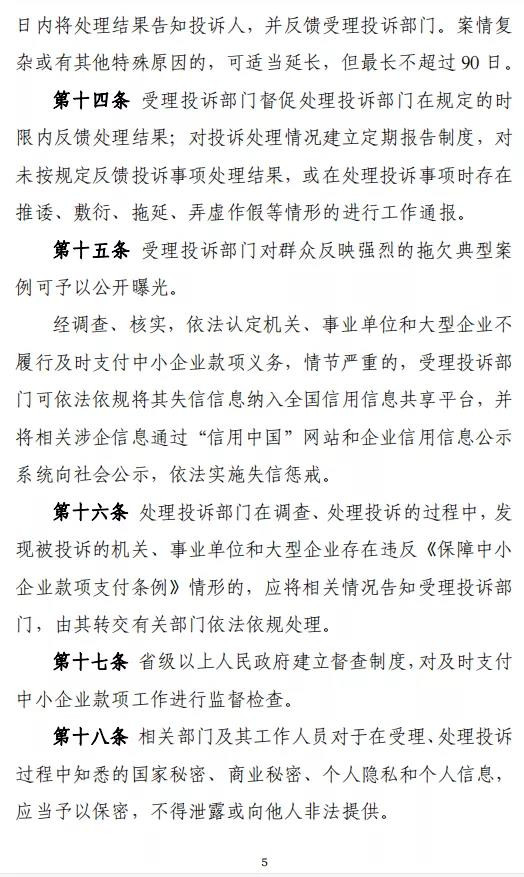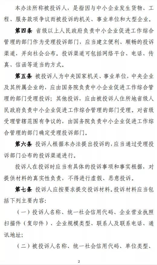 中小企業(yè)就機關(guān)、事業(yè)單位和大型企業(yè)違反合同約定拒絕或者遲延支付貨物、工程、服務(wù)款項提起投訴,省級以上人民政府負(fù)責(zé)中小企業(yè)促進(jìn)工作綜合管理的部門受理投訴,有關(guān)部門、地方人民政府對投訴做出處理,適用本辦法。