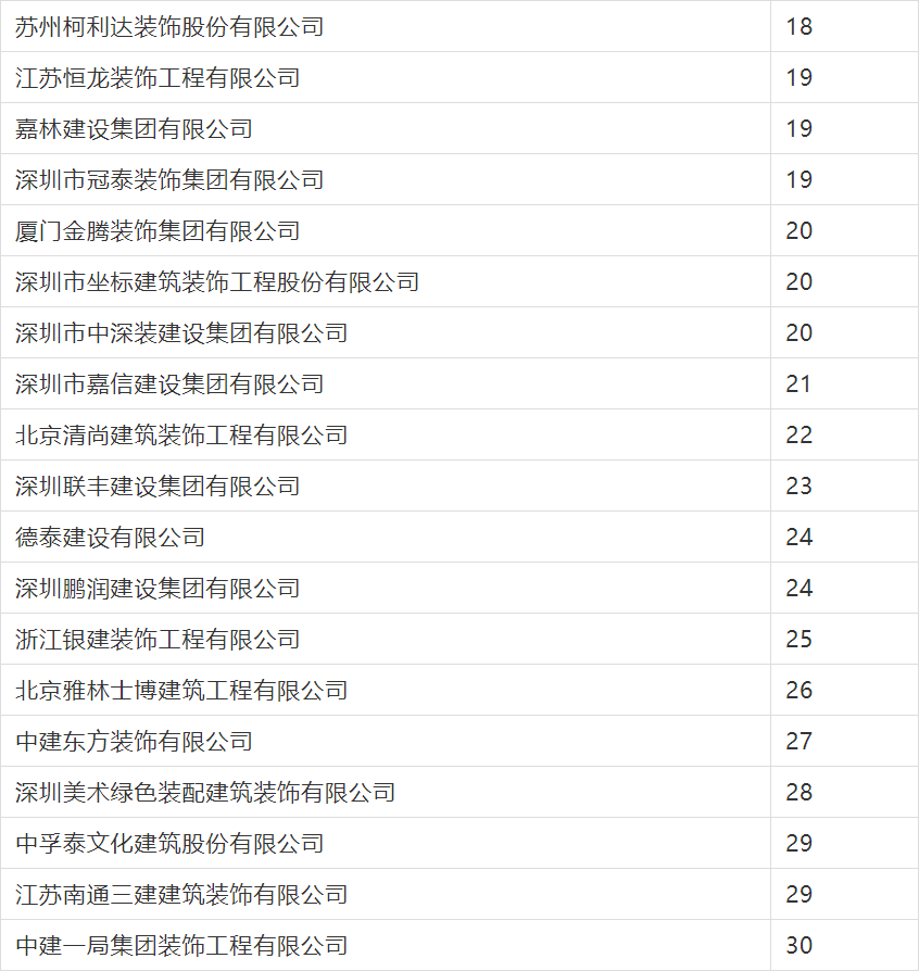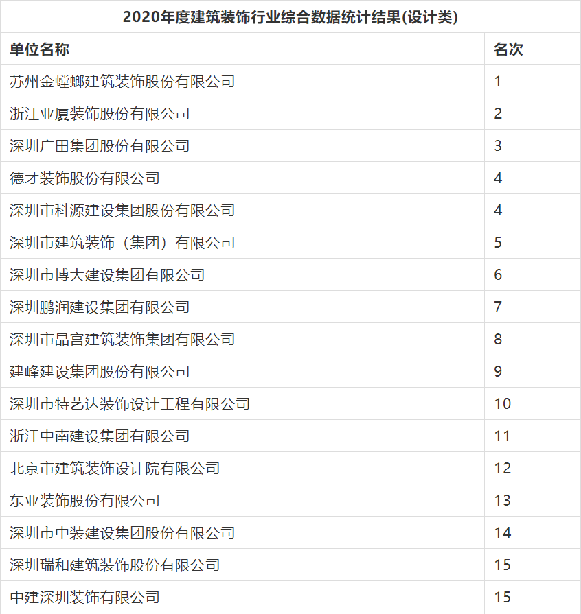 2020年度行業綜合數據統計分為裝飾、幕墻、設計三類,現將2020年度建筑裝飾行業數據統計結果名單予以公告。