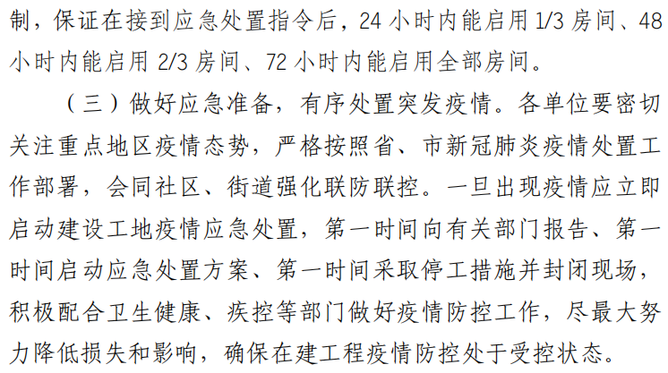6、一旦出現疫情應立即啟動建設工地疫情應急處置,第一時間向有關部門報告、第一時間啟動應急處置方案、第一時間采取停工措施并封閉現場。