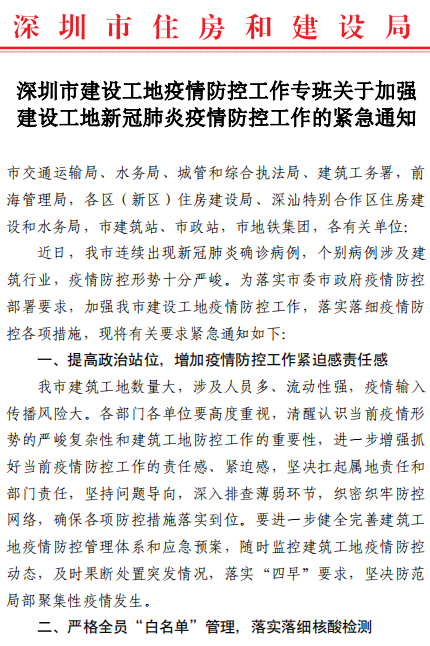 7月18日,深圳發布《關于加強建設工地新冠肺炎疫情防控工作的緊急通知》。