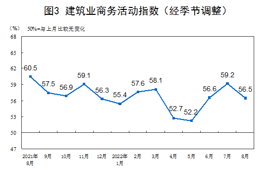 8月份,非制造業商務活動指數為52.6%,比上月下降1.2個百分點,仍位于擴張區間,非制造業連續三個月恢復性增長。
