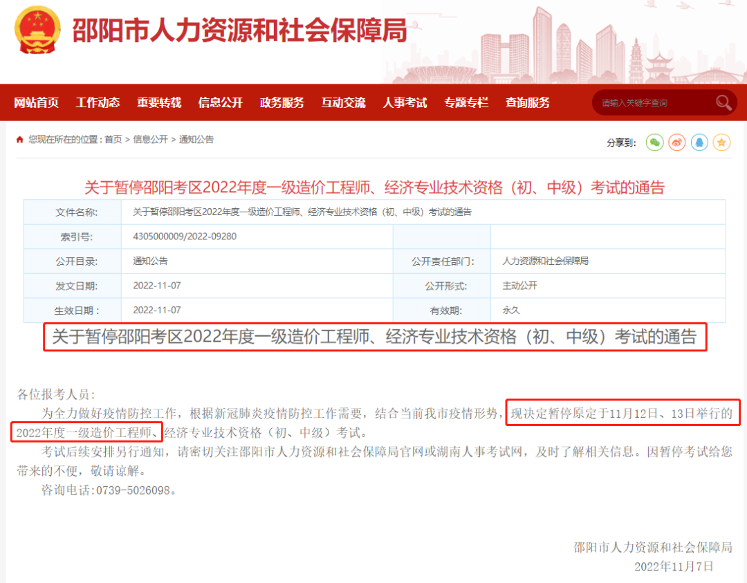 11月7日,湖南懷化和邵陽通知:暫停原定于11月12日、13日舉行的一級造價師考試。